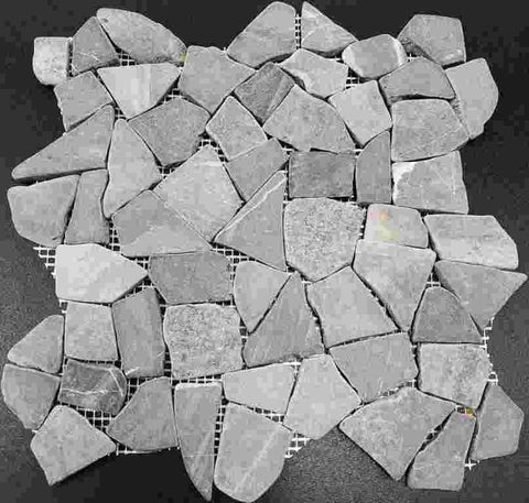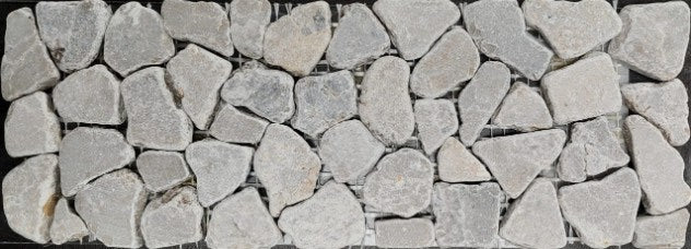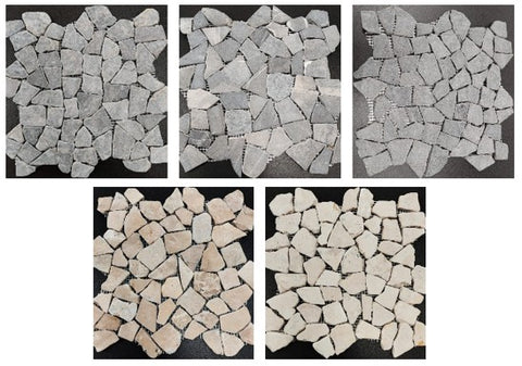 Black, Brown, Grey, Ice and White natural river stone pebbles mounted on 10×100 and 30x30 cm mesh sheets. These sheets are designed to interlock for a seamless look when laid.